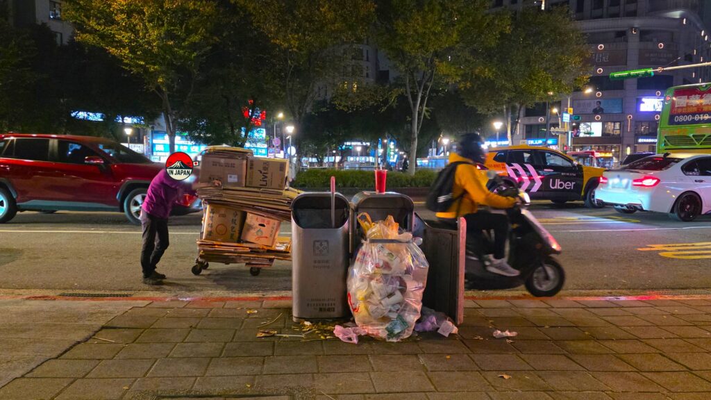 Ich war verwundert. Mir waren schon die älteren Menschen aufgefallen, die unzählige Pappkartons sammeln. Sie reißen sich geradezu um jeden Karton, stapeln sie höher, als sie selbst groß sind, auf ihre klapprigen Rollwagen und schieben sie durch die Straßen Taiwans. Doch ich dachte mir zunächst nichts dabei. Es war ein vertrautes Bild für mich, das ich aus vielen K-Dramen kannte (aber auch darüber hatte ich mir nie Gedanken gemacht). Doch als die alte Frau meine Dose unbedingt haben wollte, obwohl es hier nicht einmal ein Pfandsystem gibt, begann ich nachzudenken und nachzuforschen.